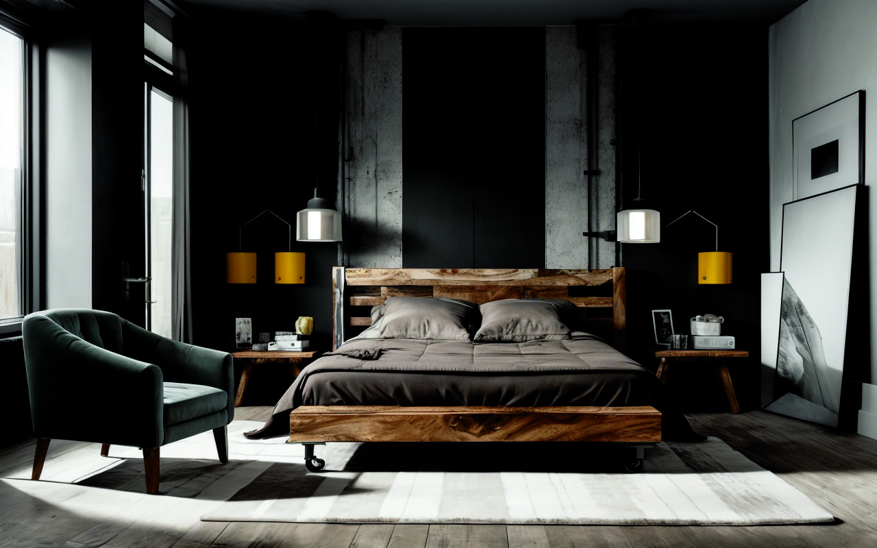 Мебель для спальни в индустриальном стиле часто содержит крупные деревянные каркасы с металлическими элементами. Каркасы могут оставаться необработанными или иметь эффект состаривания. Важным аспектом является использование износостойких матрасов и качественных тканей для постельного белья.