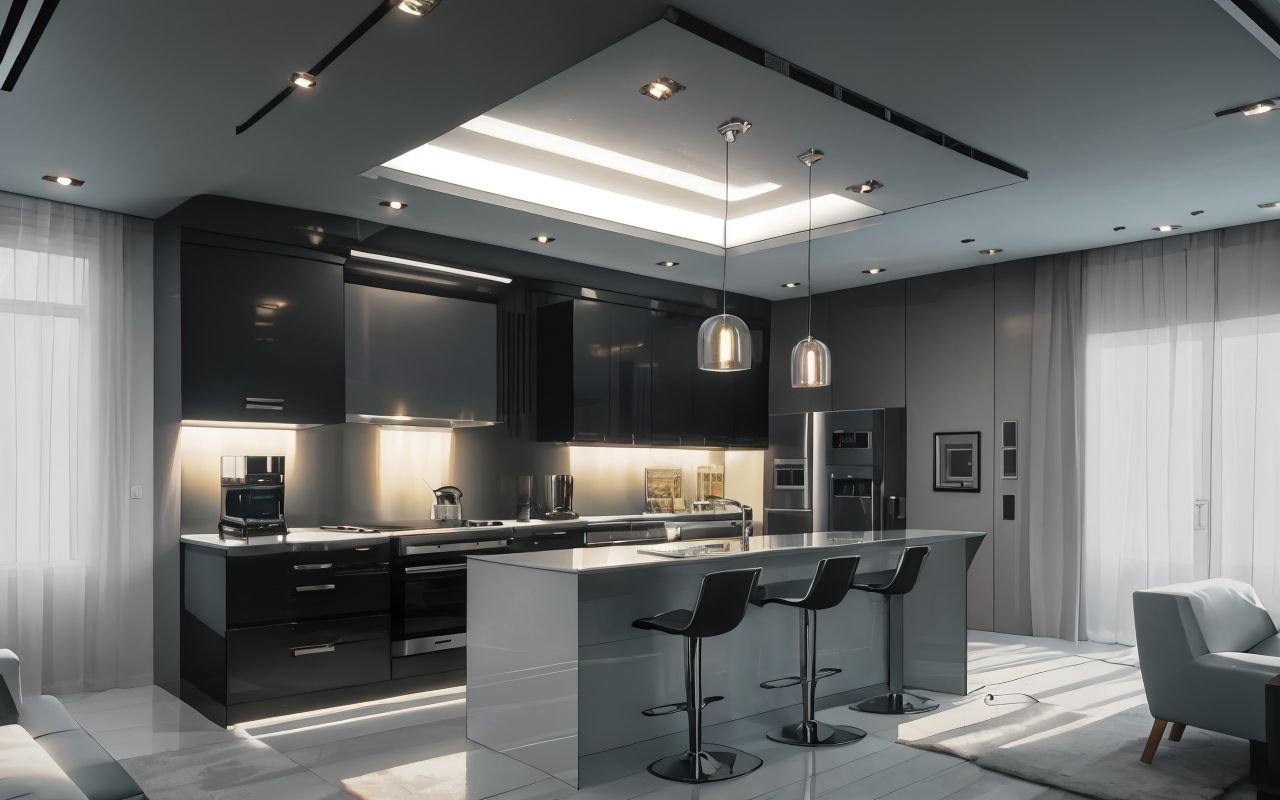 Организация освещения на кухне требует балансировки между функцией и дизайном. Основная идея — обеспечить достаточную яркость общего освещения, не мешая работе подсветки рабочих зон и создавая стильную атмосферу.