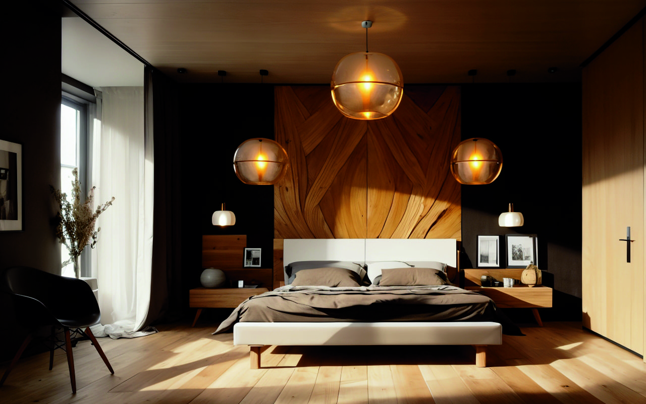 Головное правило — простота форм, отсутствие сложных декоров и фасадов. Популярны кровати с тонкими ножками, столы с гладкими поверхностями, стулья с изящными линиями. Светлое дерево — основной материал, сочетаемый с мягкими обивками и текстилем.